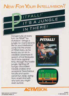Danger lurks at every turn, as Pitfall by Activision brings a jungle no-man's land to life for your Intellivision. Jump into the shoes of Pitfall Harry, as he leads you on an incredible adventure in search of lost treasures. You'll race against time, through this hostile jungle, fighting off hungry crocodiles! Deadly snakes and scorpions! Treacherous tar pits and quicksand! Run, leap, swing from vines! And with any luck, you might even survive.