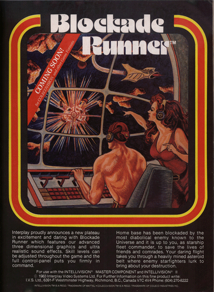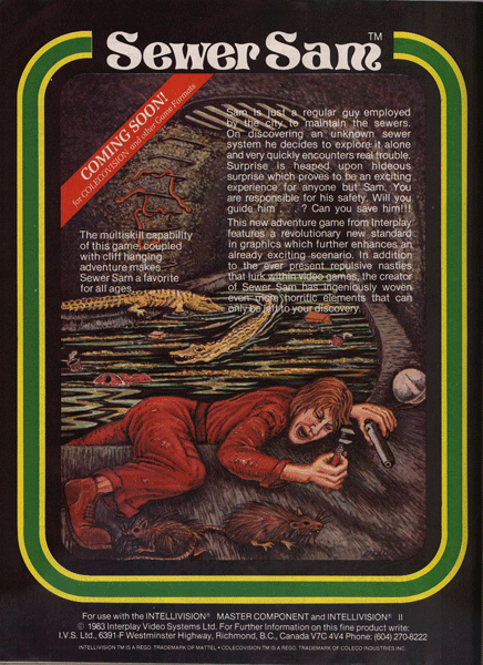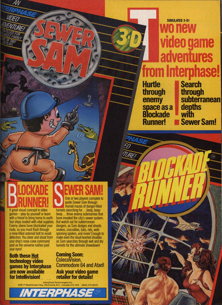 In 1983, Interphase released two games for Intellivision: Blockade Runner and Sewer Sam. These games were also released for ColecoVision, along with Aqua Attack and Squish 'Em Featuring Sam. (The ColecoVision versions of Aqua Attack and Blockade Runner are available on ColecoVision Hits for Windows).