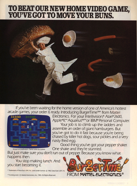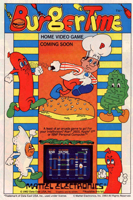 Data East did not have wide distribution for their arcade games, which had hurt when the Intellivision version of Lock 'N' Chase came out -- the name wasn't exactly a household word. But BurgerTime was so good that arcade giant Bally Midway licensed it and got the game into every arcade in America. Mattel had lucked out; it finally had the license to a hit game.