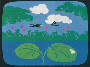 Sitting upon two lily pads in the middle of a lily pond are a pair of hungry frogs; one for you, one for your opponent. Overhead swarm delicious flies. Whether or not your frog scores his dinner while you rack up points is entirely up to you. You control the height and direction of his jump; even the flick of his long pink tongue. Leap too high or at the wrong angle and "Pl-op" your frog goes into the pond. He must swim back to his lily pad, taking away valuable scoring time while your opponent goes on racking up points. As play continues, night will come to the pond. Or, you can choose to play the entire round at night, leaping for fireflies -- in the dark.