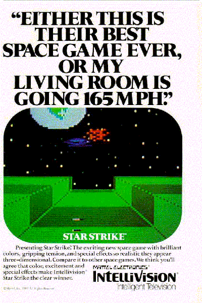 Inspired by the Death Star trench sequence from the movie Star Wars, Star Strike is actually a very simple game; most players quickly learn the timing of it to consistently win. But visually it was stunning, with a 3-D effect (accomplished by sequencing gram) not seen before in an home videogame. Heavily promoted, it was the top-selling Intellivision game of 1982, with nearly 800,000 units shipped that year.