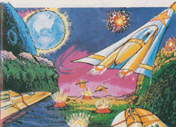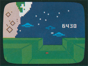 For action fast and furious, take command of a rocket-powered fighter-interceptor flying a few hundred feet off the deck. Your mission: attack and destroy alien silos defended by several squadrons of alien rocket-craft. You must react instantaneously. You are a few hundred feet above the terrain in a narrow canyon. That's where the aliens have dug in. Maneuvering room is severely limited. Meanwhile, earth is slowly coming into target position for the silos. Remember, you alone can save earth. Don't miss.