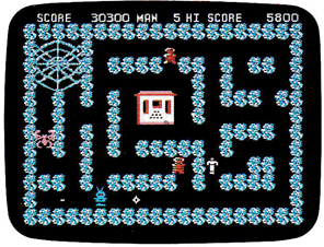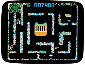 The relentless robots have you on the run. Destroy one, and it's replaced by an even faster and smarter one! There's a bunker to hide in, but be careful! The spiders and bats can give a stunning sting to slow you down and make you easy prey for the alien robots! (One or two players.)