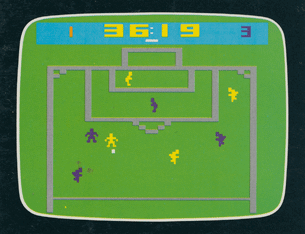A two=player game that adapts the fast-paced movement of soccer to your video system. Realistic scrolling field action - feint, pass,...and score! All accompanied by exciting sound effects.